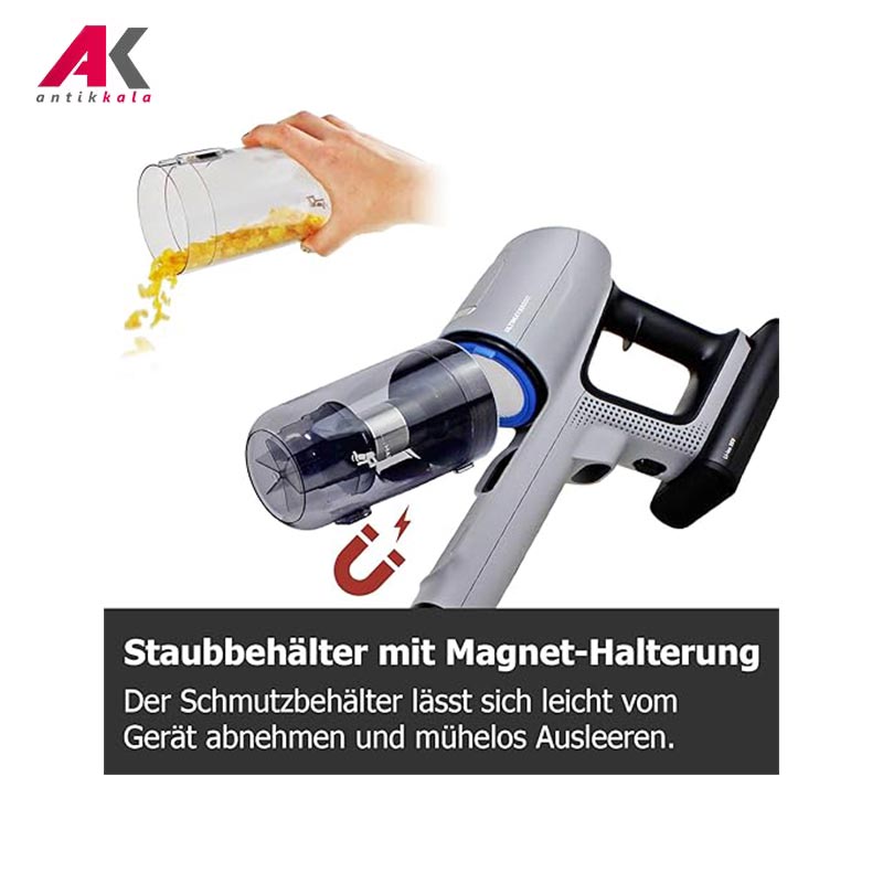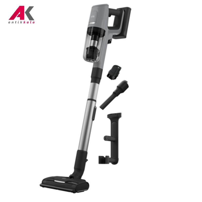 جاروشارژی آاگ مدل AP81UB25UG ابزاری توانمند برای نظافت انواع سطوح منزل شما است. برخورداری از موتور قدرتمند با ایجاد حرکت چرخشی موجب شده عملکرد دستگاه برای جذب گرد و غبارها و زبالههای ریز و درشت تا حد چشمگیری ارتقاء پیدا کند. سطح قدرت عملکرد این محصول در 3 حالت پایین، متوسط و توربو قابل تنظیم است. علاوه بر این امکان انتخاب حالت خودکار مکش نیز وجود دارد که در این حالت دستگاه بهصورت خودکار میزان مکش متناسب با نوع سطح را اعمال میکند. این تنظیمات قدرت از طریق پنل کاربری طراحی شده روی بخش بالایی دسته جاروشارژی انجام میشود. پنل دستگاه دارای یک صفحه نمایش ال ای دی است که اطلاعات مربوط به قدرت و همچنین میزان باتری را به وضوح به نمایش میکشد. وجود این صفحه کنترل با نمایشگر علاوه بر ایجاد رابط کاربری آسان، جلوه ظاهری منحصربهفردی را نیز به این جاروشارژی بخشیده است. باتری این جاروشارژی 2 در 1 آاگ از نوع باتری لیتیوم یونی و با ولتاژ 25.2 ولت است. شارژ کامل این باتری در مدت زمان 2.5 ساعت انجام شده و شارژدهی آن در حالت استفاده با نازل اصلی 35 دقیقه و در حالت استفاده با قدرت توربو 6 دقیقه خواهد بود. گفتنی است شارژ باتری از طریق قرارگیری دستگاه روی استند مربوطه انجام میشود. از ویژگیهای فنی جاروشارژی آاگ میتوان به تکنولوژی سیستم BrushRollClean اشاره کرد. بهلطف تعبیه این سیستم برای نظافت برس نیازی به جدا کردن آن از دستگاه و دردسرهای بعد از آن نیست چرا که با فشار دادن پدال تعبیه شده روی نازل تنها در 10 ثانیه برس نازل به طور خودکار تمیز خواهد شد. ظرفیت مخزن این دستگاه 0.4 لیتر است که با مجهز بودن به یک فیلتر بهداشتی چرخشی قادر به جذب ریز ذرات آلرژیزای موجود در هوا نیز خواهد بود.
