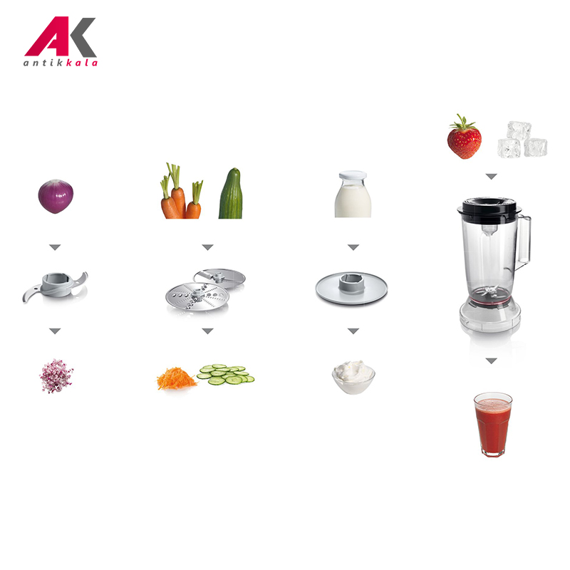 دستگاهی MultiTalent 3 با طراحی ساده و در عین حال شیک و کارایی بالا برای آشپزخانه شما از بارزههای غذاساز بوش مدل BOSCH MCM3201B محسوب میشود. آشپزخانه شما بی شک نیازمند وسیله یا وسایلی است که بتواند شمارا در تهیه انواع ترکیبات غذایی روزمره و ضروری در سریعترین زمان ممکن یاری کند. غذاساز چندکاره یکی از این کالاها است که در قالب یک پکیج شامل چندین عملکرد انواع نیازهای شما را مرتفع میسازد. دیگر ویژگی مثبت غذاساز چندکاره 3201B بوش این است که با خرید آن در فضای آزاد آشپزخانه شما صرفهجویی خواهد شد. همچنین با مقایسه قیمت غذاساز به نسبت عملکردها بهصورت تکبهتک و مجزا، پی خواهید برد که خرید این دستگاه کاملاً مقرونبهصرفه است. توان موتور 800 واتی این دستگاه با قابلیت تنظیم در دو سرعت به انضمام عملکرد پالس، تهیه انواع مواد غذایی برای دستیابی به بهترینپ نتیجه ممکن را میسر کرده است. برخورداری از عملکرد Pulse با استفاده از حداکثر توان موتور دستگاه موجب شده انجام فرایند بر روی سرسختترین مواد غذایی برای ایجاد ترکیبی یکنواخت و بدون اشکال بهآسانی صورت پذیرد. تعداد 30 عملکرد متنوع غذاساز MCM3201B بوش، از طریق اتصال پیوستهای متنوع انجام میشود؛ پارچ مخلوطکن 1 لیتری، کاسه غذاساز 2.3 لیتری با یک قطعه ورودی مجزا و یک عدد ابزار دیسک مربوط به قرارگیری تیغههای رنده مواد غذایی با 2 عملکرد متفاوت از جمله ابزارهای کاربردی این غذاساز چندکاره به شمار میآیند. کاسه غذاساز 2.3 لیتری، با امکان تهیه خمیر تا میزان 0.5 کیلوگرم، انتخابی مناسب برای یک خانواده کوچک خواهد بود. تیغه بهکاررفته در این غذاساز چندکاره از جنس استیل ضدزنگ و فناوری پیشرفته MultiLevel6 عملیات برش انواع مواد غذایی را به بهترین شکل ممکن به انجام میرساند. تیغه استیل تعبیه شده در یک دیسک دستگاه امکان انجام فرایند رنده و برش در قطعها و اشکال مختلف را به راحتی مهیا میکنند. تمام بخشهای پلاستیکی مرتبط با مواد غذایی در این غذاساز فاقد ماده شیمیایی مضر BPA بوده بنابراین ترکیبات تهیه شده دارای حداکثر سلامت و کیفیت ممکن است. در کنار طراحی جمعوجور و ارگونومیک این غذاساز که متناسب با چیدمان هر نوع دکوراسیون آشپزخانه است، به لطف وجود پایههای ضدلغزش که از حرکت دستگاه در حین فرایند جلوگیری کرده و همچنین تعبیه قفل درپوش، ایمنی انجام فرایند نیز تضمین میشود. تفکیک قطعات و امکان شستشوی آسان آنها پس از هر بار انجام فرایند دیگر امکان مهم غذاساز بوش مدل BOSCH MCM3201B بهحساب میآید.