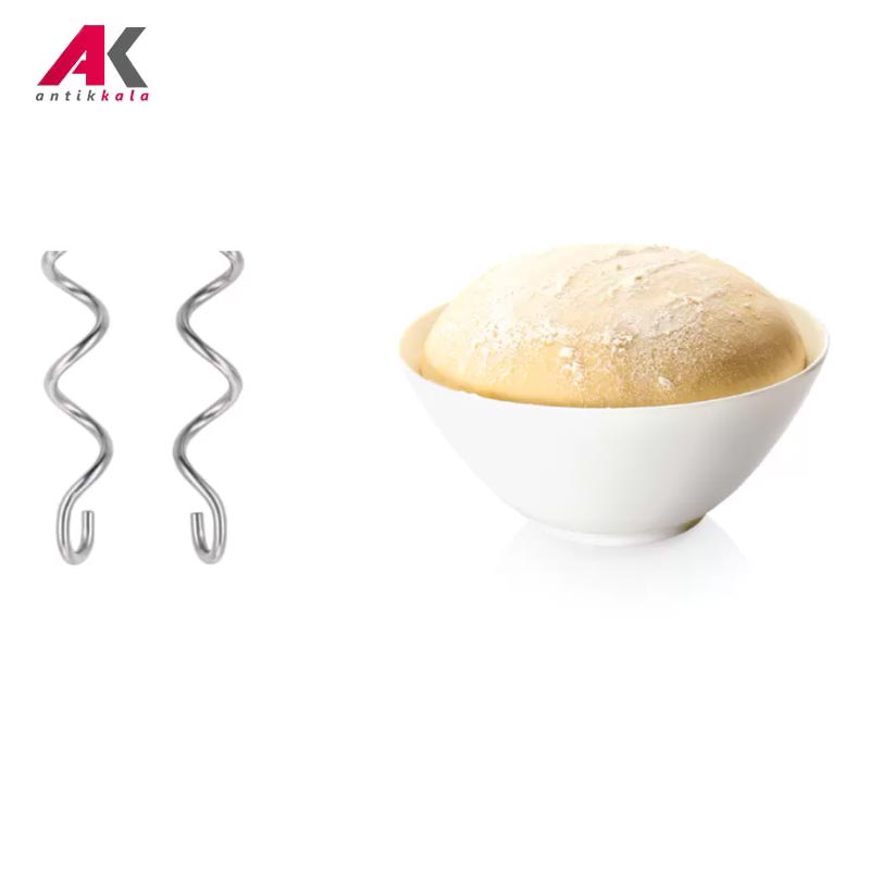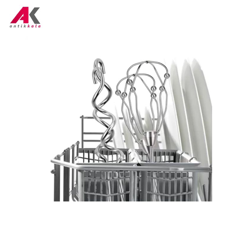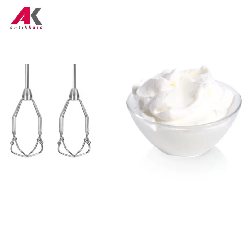وجود دو میله همزن موسوم به FINE CREAMER از جنس استیل ضدزنگ کار کردن را برای شما آسانتر میکند. این میلهها بهگونهای طراحی شدند تا با استفاده از آن به مواد غذایی خود پف و حجم بسیار بیشتری را بدهید و به پخت ایدهآل مواد غذایی خود برسید. برخورداری از توپهای کوچک تعبیه شده در مکانیزم ساخت این میلهها موجب ایجاد هوای خالی داخل خمیر شده؛ بنابراین ترکیب داری حجم و پف بیشتری خواهد شد. علاوه بر این وجود دو قلاب استیل ضدزنگ بهمنظور سهولت در ورز دادن خمیر نان و پیتزا و ترکیبات چالشبرانگیز بهعنوان دیگر ابزار جانبی در این دستگاه تعبیه شده است. میلههای همزن و خمیرزن را به آسانی میتوان زیر شیر آب تمیز کرد و یا داخل ماشین ظرفشویی گذاشت تا با استفاده از آن قطعات شستشو داده شوند.