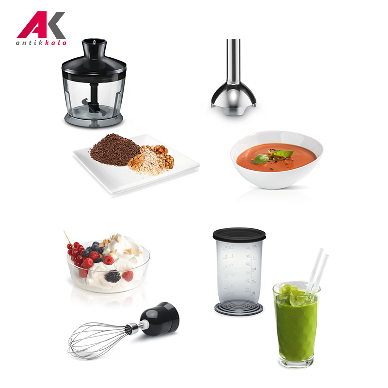 پیمانه شفاف درجه بندی شده برای مخلوط کردن به همراه درپوش ,خردکن کوچک مناسب سبزیجات، آجیل، پیاز، گوشت، پنیر و … ,همزن بالونی از جنس استیل ضد زنگ برای هم زدن سفیده تخم مرغ، خامه یا مخلوط کردن خمیر پن کیک |