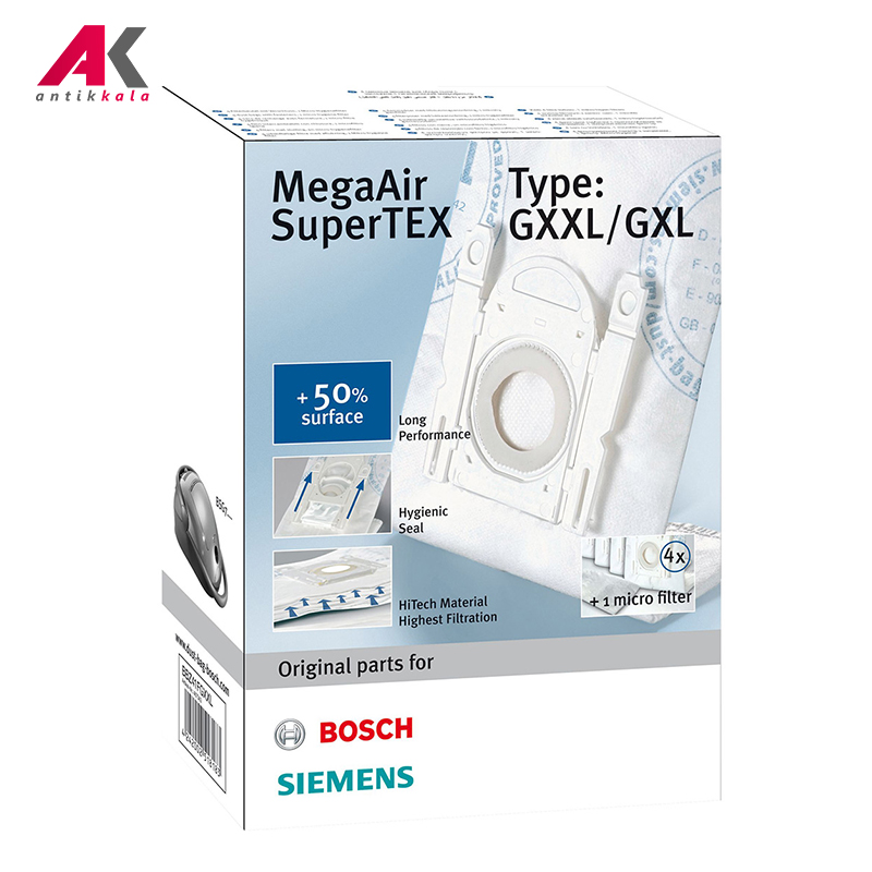 پاکت جارو برقی بوش مدل BOSCH MegaAir SuperTEX BBZ41FGXXLT، شامل یک میکروفیلتر مناسب برای رده های BSG7, BSGL5, BGL45 و BGB45، یکی از تولیدات بیشمار برند بوش است. میکروفیلتر باکیفیت پاکت BBZ41FGXXLT به مکش هرچه بیشتر پسماندها و گرد و خاک کمک میکند. جفت شدن مناسب این پاکت در درون دستگاه از ورود هرگونه ذره به داخل موتور جارو برقی جلوگیری کرده بنابراین موجب افزایش طول عمر موتور جارو برقی میشود. بهداشت رضایت بخش محیط با تمیزکنددگی 99.9% از ذرات ریز گرد و غبار، 50% کارکرد طولانی تر، Extreme Robust یا عدم آسیب پذیری پاکت BBZ41FGXXLT با بهرهگیری از بافت الیاف پشمی و مقاومت در برابر پارگی و HighPower یا عملکرد تمیزکنندگی بالا حتی در زمان پر بودن کیسه از دیگر امکانات ویژه این پاکت جارو برقی بشمار میآیند. لازم به ذکر است هر بسته از پاکت BOSCH MegaAir SuperTEX BBZ41FGXXLT شامل 4 عدد پاکت جارو برقی است.