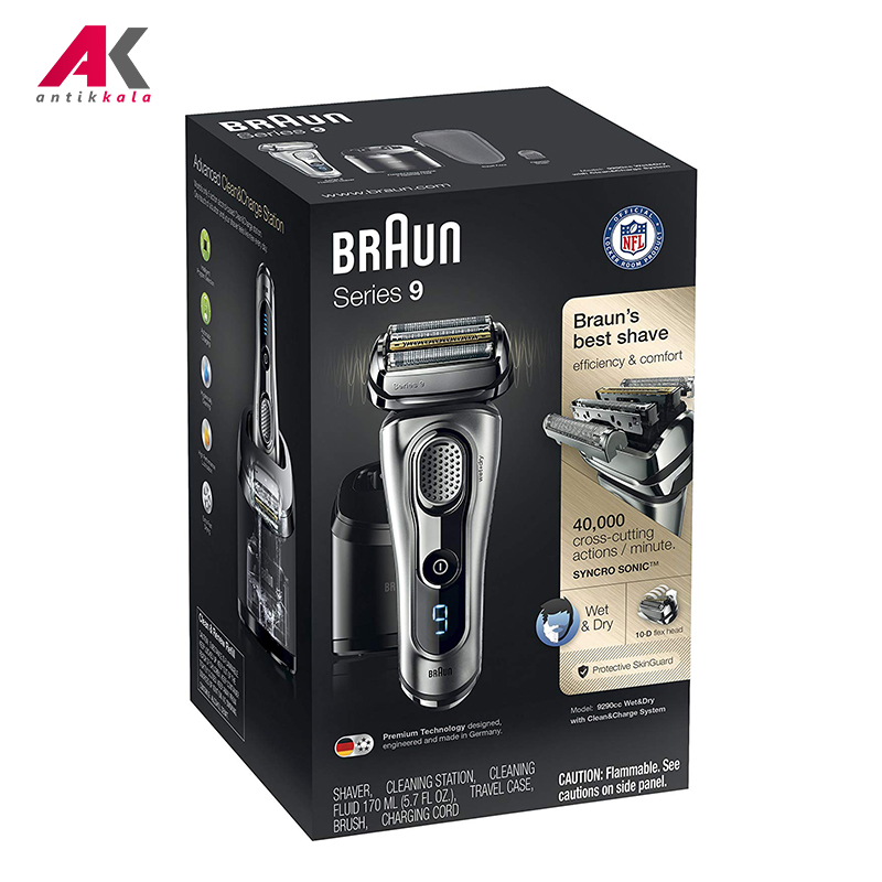 ریش تراش براون سری 9 مدل 9290cc، یکی از جدید ترین محصولات شرکت BRAUN می باشد، که این محصول در کنار زیبایی منحصر به فرد خود از کیفیت و کارایی بالایی برخوردار است. این محصول با طراحی شیک و دسته ارگونومیک خود باعث استفاده آسان و راحت می شود. ریش تراش براون مدل 9290cc دارای سری چهار قسمتی منعطف می باشد که با قابلیت تحرک زیاد و حرکت در نقاط مختلف صورت موهای خوابیده صورت را به خوبی اصلاح می کند، همچنین این محصول دارای یک سری خط زن می باشد که می توان از این سری برای ایجاد خط ریش و اصلاح موهای گردن از آن استفاده کرد. ریش تراش 9290 براون دارای باتری شارژی می باشد که این نوع باتری از نوع Lithium-ion بوده که شما می توانید پس از 60 دقیقه شارژ کامل از آن به مدت 50 دقیقه به صورت بدون سیم از آن استفاده کرد. ریش تراش براون 9290cc کاملا ضد آب بوده و امکان اصلاح به دو صورت خشک و مرطوب را داراست و می توان از این محصول در حمام و زیر دوش استفاده کرد. از دیگر ویژگی مهم این محصول می توان به پایه شستشوی مخصوص آن اشاره کرد که این پایه قابلیت شارژ کردن دستگاه را هم داراست، که شما می توانید پس از هر بار استفاده، دستگاه را در پایه شستشو قرار داده تا سری های دستگاه کاملا تمیز شده و برای اصلاح بعدی آماده شود. ریش تراش 9290 براون دارای صفحه نمایشگر LED بر روی بدنه خود می باشد که میزان شارژ دستگاه را به شما نشان می دهد.