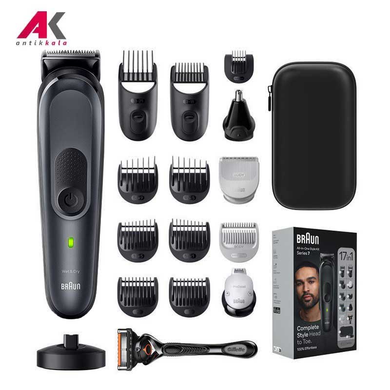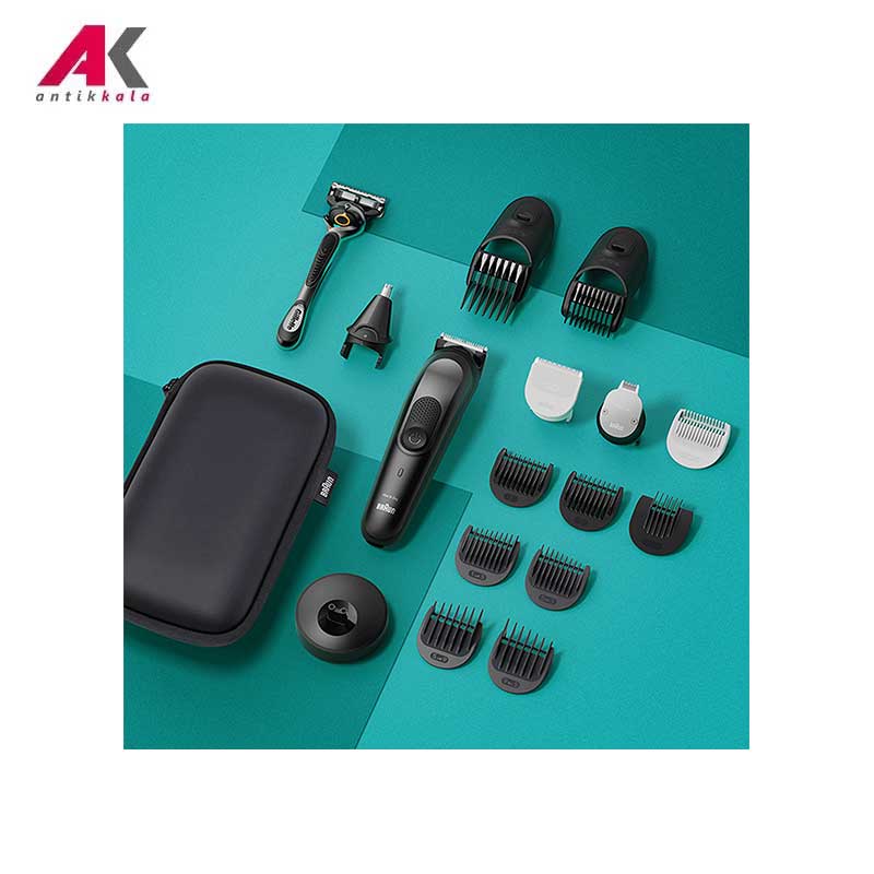2 سری شانه 1 و 2 میلیمتری ,2 سری شانه با قابلیت تنظیم ارتفاع به اندازه های 3 تا 11 میلیمتر و 13 تا 21 میلیمتر با قابلیت اصلاح موی سر ,سری اصلاح جزئیات ,سری اصلاح موهای بدن ,سری اصلی برای اصلاح دقیق موهای صورت ,سری مخصوص برای اصلاح نواحی حساس ,سری مخصوص موهای گوش و بینی ,1 عدد شانه مرتب کردن ابرو ,2 عدد شانه 1 تا 5 میلیمتری محو کننده ریش ,2 عدد شانه 5 تا 9 میلیمتری محو کننده مو |