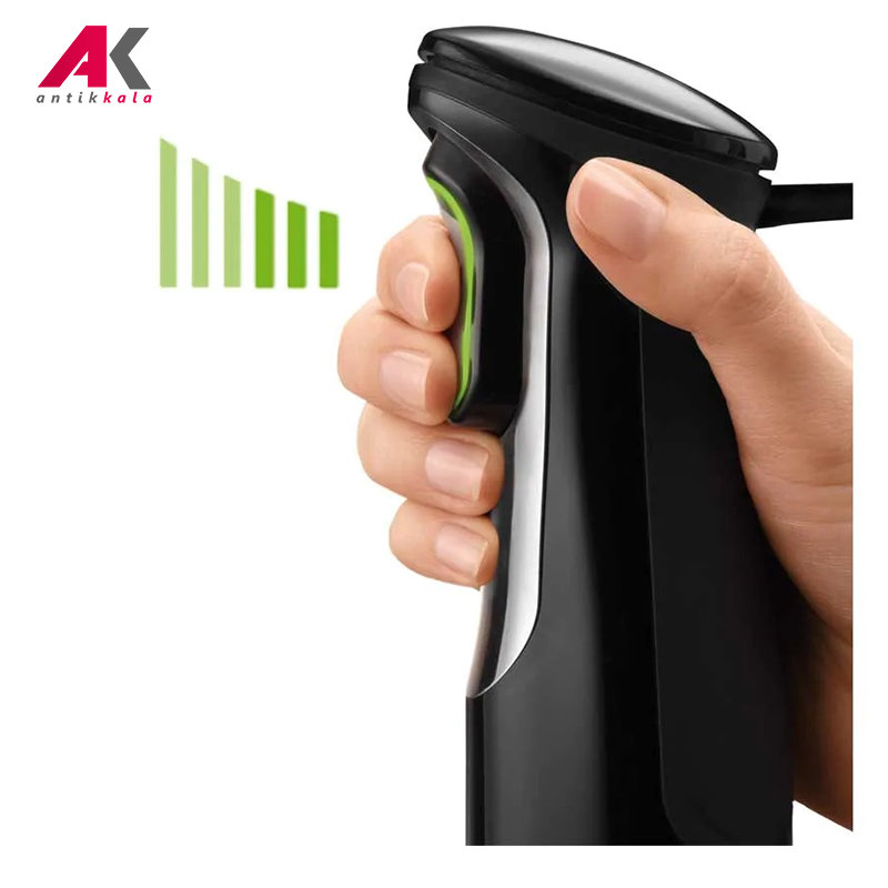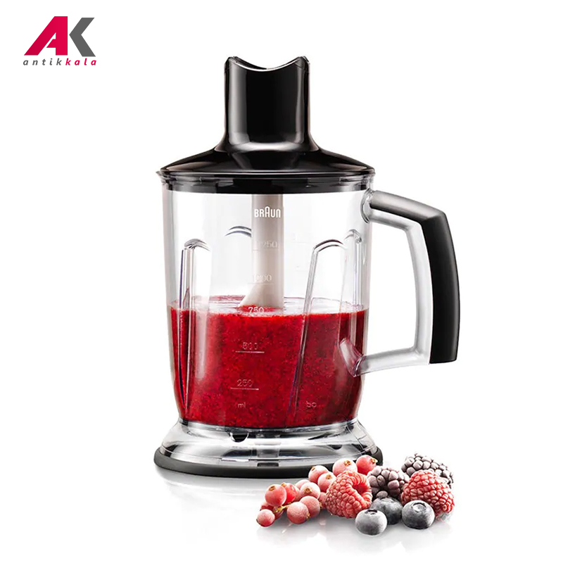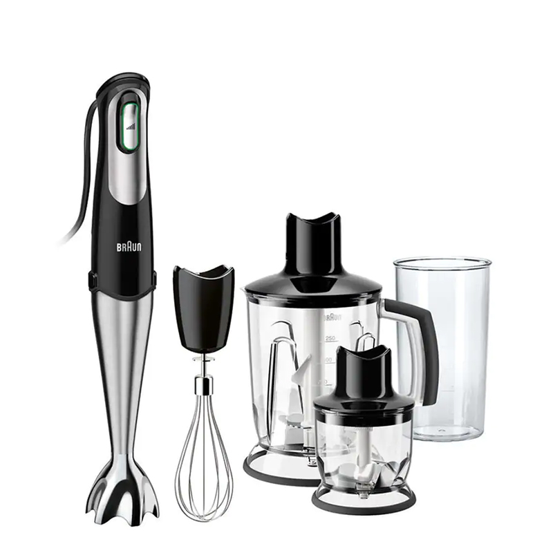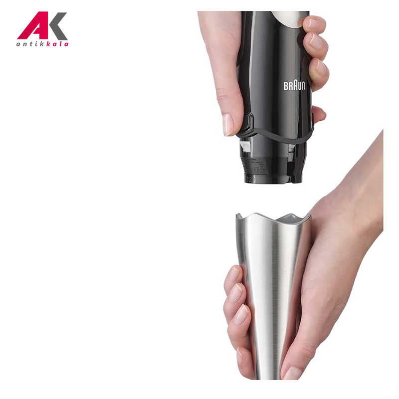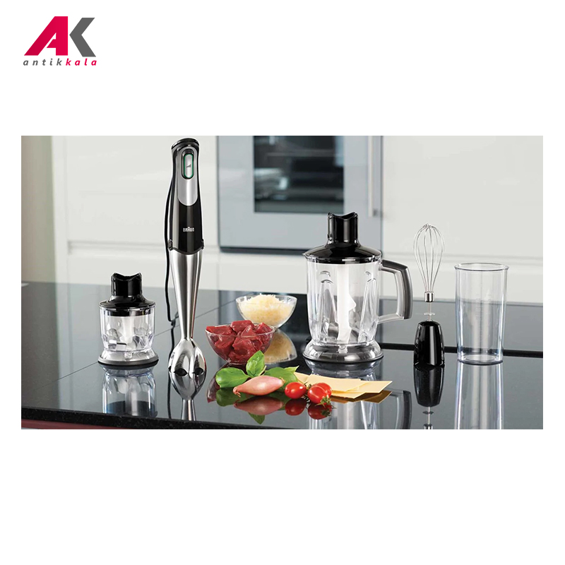 همزن، خردکن و گوشتکوب برقی براون مدل MQ745 با حداکثر توان 750 وات محصولی با طراحی شیک و زیبا ساخت کشور رومانی است که برای مصارف خانگی تهیه شده است و کاربرد فراوانی برای آماده سازی مواد غذایی در آشپزخانه دارد. به کمک این دستگاه می توانید مواد غذایی مختلف را هم زده، خرد کرده و مخلوط نمایید. تکنولوژی Smart Speed این گوشتکوب برقی به شما کمک می کند که بنا به حجم و سختی مواد فقط با فشار دادن کلید، قدرت را کم یا زیاد کنید که گوشت کوب بالاترین عملکرد را برای شما داشته باشد. بدنه دستگاه با طراحی ارگونومیک از جنس پلاستیک بوده و قسمتی از آن دارای روکش نرم سیلیکونی است که کار با این محصول را آسان و لذت بخش نموده است. همزن براون دارای یک کلید فشاری برای روشن کردن دستگاه است که کنترل سرعت هوشمند دارد و با توجه به نوع ماده غذایی و حجم آن می توانید سرعت مناسب را برای کارتان تنظیم نمایید و هر چه دکمه را بیشتر بفشارید سرعت آن نیز بیشتر می شود. این محصول مجهز به قفل و چراغ نشانگر می باشد که وضعیت آماده بودن دستگاه برای کار کردن را نشان می دهد. همزن برقی 745 براون مجهز به میله گوشتکوب از جنس استیل ضد زنگ می باشد که توسط آن می توانید انواع مواد غذایی را مخلوط کنید و در لیوان 600 میلی لیتری پایه بلند همراه با آن استفاده نمایید. دستگاه مجهز به محفظه مدرج خردکن بزرگ با ظرفیت 1.25 لیتر برای مخلوط کردن مواد با حجم بیشتر و خردکن کوچک با ظرفیت 350 میلی لیتر می باشد که از طریق بدنه شفاف آن ها می توانید محتویات درون ظرف را مشاهده کنید و مقدار خرد و مخلوط شدن مواد را ببینید، تیغه های تیز خردکن که از جنس استیل ضدزنگ هستند، قابلیت خرد کردن یخ را نیز دارند، و به راحتی نیز قابل جداسازی و شستشو هستند. از همزن بادکنکی براون می توان برای هم زدن خامه، تخم مرغ و مایه کیک و شیرینی نیز استفاده نمود. محفظه هر دو خردکن دارای کفه ضد لغزش می باشد و از سر خوردن و لرزش آن ها هنگام کار جلوگیری می کند. برای تعویض سری ها کافیست از دو دکمه فشاری روی بدنه استفاده کرده و آن ها را از این طریق تعویض کنید. از قطعات این دستگاه به جز بدنه اصلی و درپوش خردکن، بقیه را می توان جهت شستشو درون ماشین ظرفشویی قرار داد.