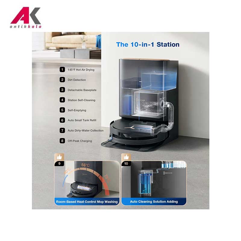 پر کردن خودکار مخزن آب ,تخلیه خودکار مخزن گرد و غبار ,خشک کردن پد زمین شوی با هوای گرم 145 درجه فارنهایت ,دارای حالت های شارژ سریع و شارژ در زمان غیر اوج مصرف ,سیستم تشخیص کثیفی (مخزن رباتیک و پد شستشو) ,شستشوی خودکار پد زمین شوی با آب گرم ,صفحه پایه قابل جدا شدن |