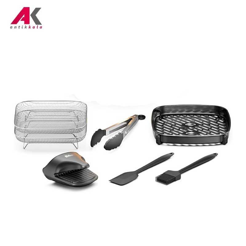 دستکش سیلیکونی ,ظرف مخصوص سوخاری ,کاردک ,2 قفسه توری فلزی ,برس آغشته کردن سس یا روغن به مواد غذایی ,چنگک |