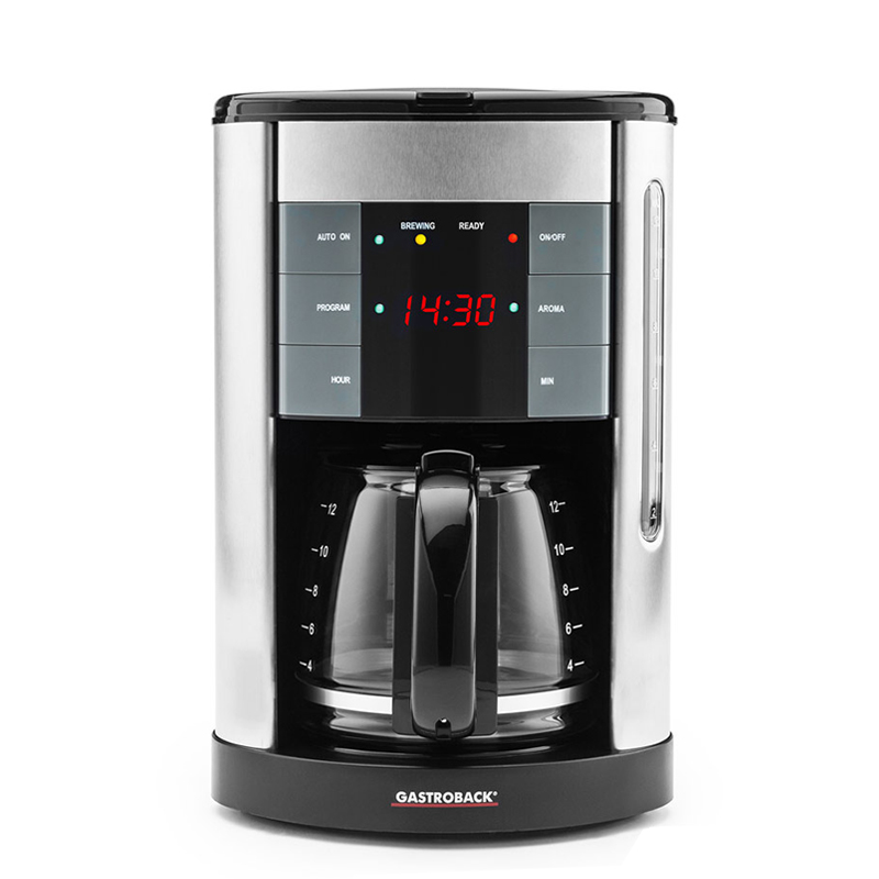 قهوه ساز گاستروبک مدل GASTROBACK 42703 دستگاهی با طراحی شیک و جذاب و همچنین کاربری ارگونومیک انتخابی مناسب برای تهیه روزانه نوشیدنی قهوه است. برخورداری از فیلتر کاغذی قابل تعویض موجب ایجاد اصالت در طعم قهوه مورد نظر میشود. توان مصرفی 950 واتی این قهوه ساز در کنار پایش دقیق میزان دمای فرایند دم آوری شما را در تهیه نوشیدنی برای دستیابی به نتایجی عالی یاری میدهد. مخزن آب قهوه ساز گاستروبک 42703 دارای ظرفیت 1.7 لیتر و مندرج است. قوری شیشهای این دستگاه نیز با ساختی از جنس شیشه ظرفیت تهیه نوشیدنی تا 12 فنجان را خواهد داشت. پنل دستگاه با بهکارگیری دکمههای بزرگ و نمایشگری با وضح تصویر بالا رابط کاربری ایدهآلی را برای مصرفکننده ایجاد کرده است. تنظیمات مربوط به برنامهدهی خودکار و زماندهی فرایند بر روی این پنل تعبیه شده است. برخورداری از سیستم ضدچکه در هنگام جابجایی قوری از چکیدن قطرات نوشیدنی بر روی فضای اطراف دستگاه جلوگیری میکند. کلیه بخشهای پلاستیکی در تماس با نوشیدنی فاقد ماده شیمیایی مضر BPA بوده که این امر سلامت نوشیدنی حاصله را تضمین خواهد کرد. امکان شستشوی آسان قطعات دستگاه دیگر ویژگی قهوه ساز گاستروبک مدل 42703 قلمداد میشود.
