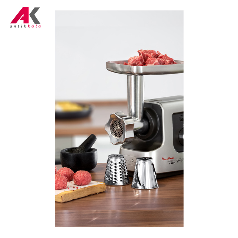 چرخ گوشت مولینکس مدل MOULINEX ME740 دستگاهی با طراحی مستحکم و عملکردی قدرتمند و چندکاره یک گزینه ایدهآل بهمنظور تکمیل آشپزخانه شما محسوب میشود. ابعاد مناسب و حجم اشغالی جمعوجور این چرخ گوشت امکان بهرهوری هرچه بیشتر از فضای موردنیاز آشپزخانه را مهیا میکند. توان مصرفی 2300 واتی با میزان خروجی چشمگیر 5 کیلوگرمی در دقیقه، این امکان را مهیا کرده است که تنها در مدت زمانی کوتاه حجم قابلتوجهی از گوشت را چرخ کنید. عملکردهای چرخ گوشت ME740 مولینکس از طریق 3 شبکه متفاوت جهت چرخ کردن گوشت در ابعاد 3، 4.7 و 8 میلیمتری از جنس استیل ضدزنگ، ابزار ساخت کبه، ابزار سوسیس ساز و دیسکهای برش، رنده و خردکن انجام میپذیرد. تیغههای بادوام و خودتیزشونده استیل دستگاه در طول مدت استفاده همواره بادوام و تیز باقی خواهد ماند. یک محفظه نگهداری جهت ذخیرهسازی اقلام جانبی دستگاه همچون شبکهها، دیسکها و کبهساز در این دستگاه تعبیه شده است. گفتنی است جنس قطعات دستگاه شامل لوله ناودانی، شبکهها و تیغهها از فلز استیل بوده که علاوه بر برخورداری از کیفیت بالا، امکان شستشو در ماشین ظرفشویی را نیز خواهد داشت. وجود کنترلر دکمهای جهت قفل لوله ناودانی این چرخ گوشت، ایمنی انجام فرایند توسط دستگاه را متضمن میشود. در هنگام انسداد گلویی و گیر کردن تکه گوشت در دستگاه با بهرهگیری از دکمه عملکرد معکوس قادر به بازگشت مواد به خارج از چرخ گوشت و از سرگیری مجدد فرایند خواهید بود. توجه داشته باشید هیچگاه دست خود را برای هدایت گوشت به داخل ورودی دخیل نکنید و همواره از اهرم هدایتکننده تعبیه شده برای این منظور استفاده کنید.
