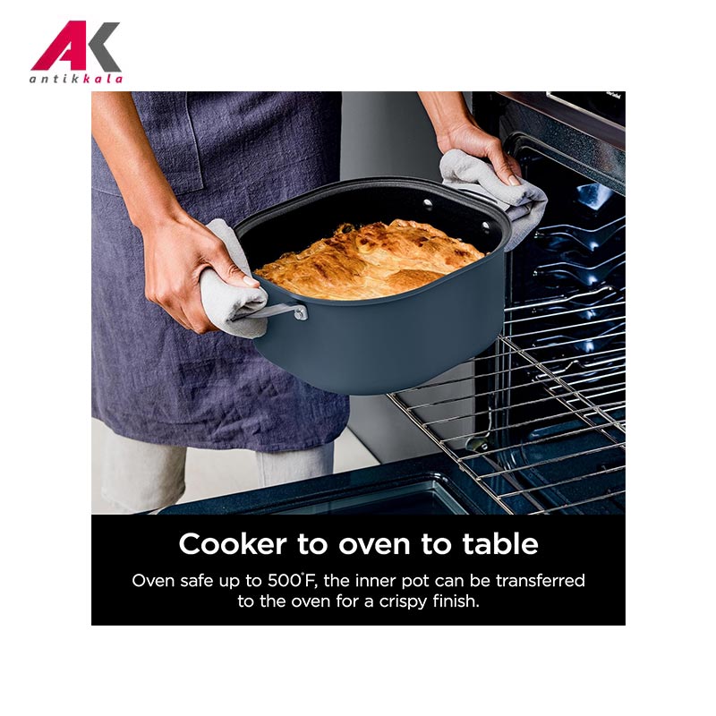 یکی از دیگر ویژگیهای جذاب این ابزار پخت و پز امکان قرارگیری قابلمه پخت آن درون فر است. متریال ساخت این قابلمه موجب شده تا در برابر دمای 500 درجه فارنهایت یا 260 درجه سانتیگراد مقاوم باشد؛ بنابراین باتوجه به قابلیت جدا کردن قابلمه از پایه این مولتی کوکر میتوانید در صورت نیاز از این قطعه درون فر استفاده کنید.