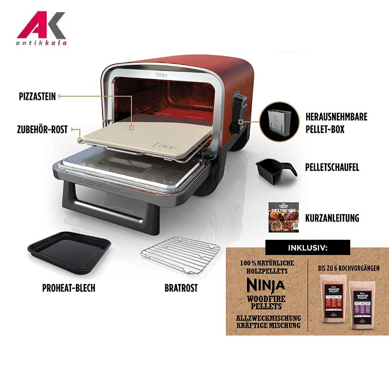 2 عدد پک تکه های چوب WoodFire ,کابل برق ,بیلچه برداشتن پیتزا ,پیمانه پلت چوبی ,جعبه پلت چوبی ,سینی برای استفاده برنامه های سطح Pro-Heat ,سینی سنگی پخت پیتزا ,قاب فلزی قرارگیری سایر لوازم جانبی ,قفسه پخت کباب |