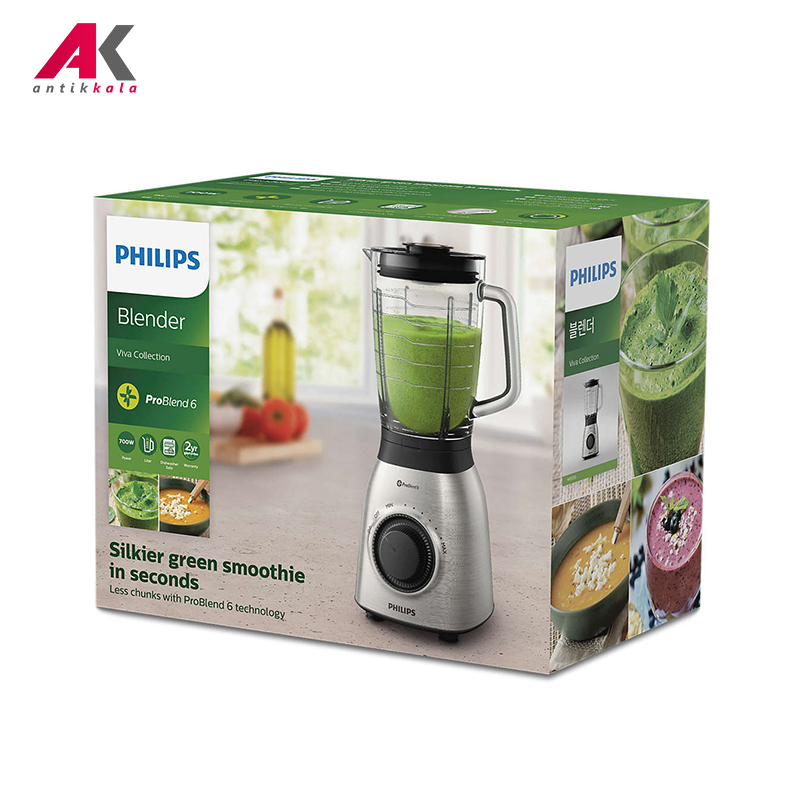 مخلوط کن فیلیپس مدل PHILIPS HR3555 دستگاهی تک کاره از سری Viva Collection این برند با کیفیت است. موتور 900 واتی این مخلوط کن با بهره گیری از فناوری ProBlend قادر به انجام عملکردی با بازدهی حداکثری بوده و از قدرت قابلقبولی برخوردار است. تیغههایی از جنس استیل ضدزنگ دستگاه با برخورداری از تکنولوژی ProBlend 6 بهترین نتیجه را برای انجام فرایند خرد و له کردن سرسختترین مواد غذایی متضمن میشود. پنل دستگاه دارای کنترل چرخشی بوده که امکان تنظیم سرعت چندگانه از بازه کمینه تا بیشنه توان موتور را به منظور کار بر روی مواد غذایی با بافت متنوع مهیا میکند. همچنین با استفاده از عملکرد Pulse قادر خواهید بود ترکیب خود را یکدست کنید و تکههای مواد غذایی را به منظور خرد شدن و اختلاط نهایی به سمت تیغه حرکت دهید. طراحی خلاقانه پارچ 1.5 لیتری مخلوط کن از جنس شیشه و مدرج و همچنین عاری از ماده شیمیایی مضر BPA، انجام فرایند ترکیب را برای دستیابی به بهترین و سالمترین نتیجه ممکن تضمین میکند. امکان تفکیک آسان قطعات تحت فناوری Easyclean انجام فرایند شستشوی آنها را حتی در ماشین ظرفشویی به سهولت فراهم میکند.