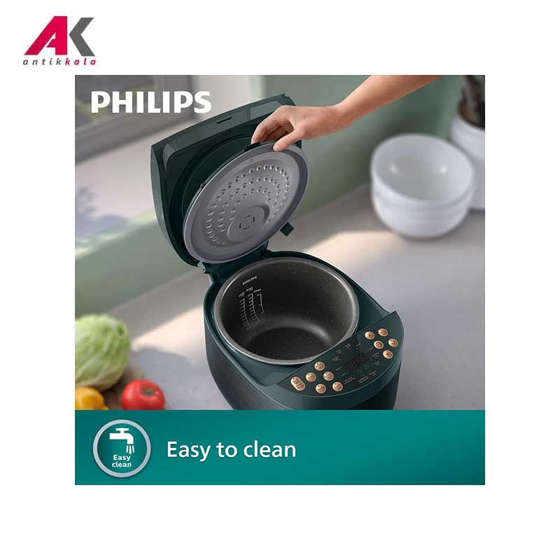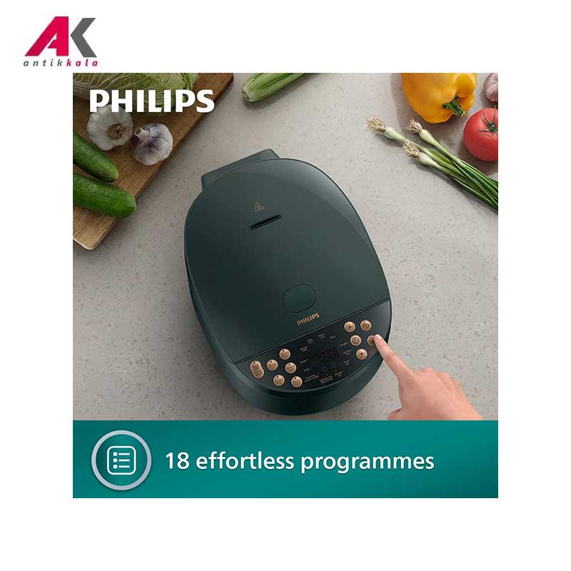 این محصول به لطف بهره گیری از توان مصرفی 940 واتی قادر است فرایندهای متنوع را با ارائه بهترین کیفیت به انجام برساند. کاسه درونی این مولتی کوکر از جنس سرامیک نچسب 6 لایه ضدخش Maifanshi است که علاوه بر تضمین کیفیت پخت، در انتقال حرارت نیز مؤثرتر عمل میکند. تایمر تعبیه شده بر روی دستگاه با رابط کاربری ساده امکان تنظیم برنامه ریزی پخت و پز را به آسانی مهیا میکند. منوی دستگاه شامل 18 برنامه پیش فرض برای انجام فرایندهایی از قبیل بخارپز، خورشت، گرم نگهدارنده، سوپ، آرام پز، کیک، پخت نان، گوشت، کته، برنج سفید، برنج قهوه ای، پخت سریع، سوشی، برنج و مرغ، کاری، برنج سفالی، برنج شفته و برنج سرخ شده بوده که شما را در تهیه غذای مدنظر خود در کوتاه ترین زمان ممکن یاری خواهد کرد. همانطور که گفته شد این مولتی کوکر عملکردهای اصلی پخت یعنی پلوپز، آرام پز و بخارپز را در اختیار شما قرار میدهد. قابلیت گرم نگهداشتن مواد غذایی، آزاد کردن فشار در صورت وجود حدی غیر عادی از فشار در داخل محفظه مولتی کوکر و شستشو و قابلیت تفکیک قطعات و شستشوی آسان آنها از دیگر ویژگیهای این مولتی کوکر فیلیپس هستند.