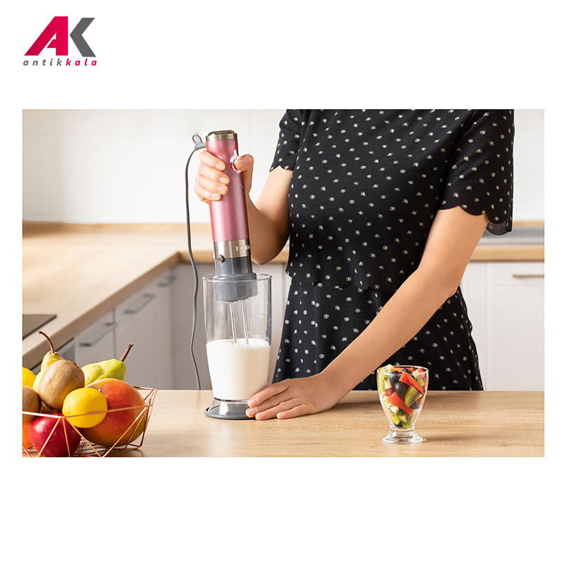 همزن دوتایی یا دوبل دیگر قطعه این دستگاه چندکاره است. با استفاده از این قطعه بهراحتی مواد غذایی مثل خامه، انواع سس، سفیده تخم مرغ و خمیرهای مختلف دسر را هم بزنید. جنس ساخت بخشهای بالونی این همزن از استیل ضدزنگ است که دوام و کیفیت آن را تضمین میکند. علاوه بر این وجود یک لیوان مخصوص فرایند هم زدن نیاز شما را مبنی بر استفاده از ظروف اضافی برطرف میکند. ظرفیت این لیوان شفاف، 800 میلیلیتر بوده و با توجه به مدرج بودن آن امکان اندازهگیری و مشاهده میزان مواد غذایی در آن وجود دارد. همچنین یک درپوش بهمنظور قرارگیری روی لیوان تعبیه شده است.