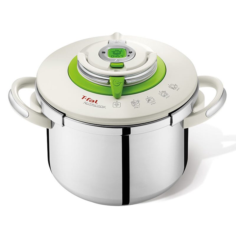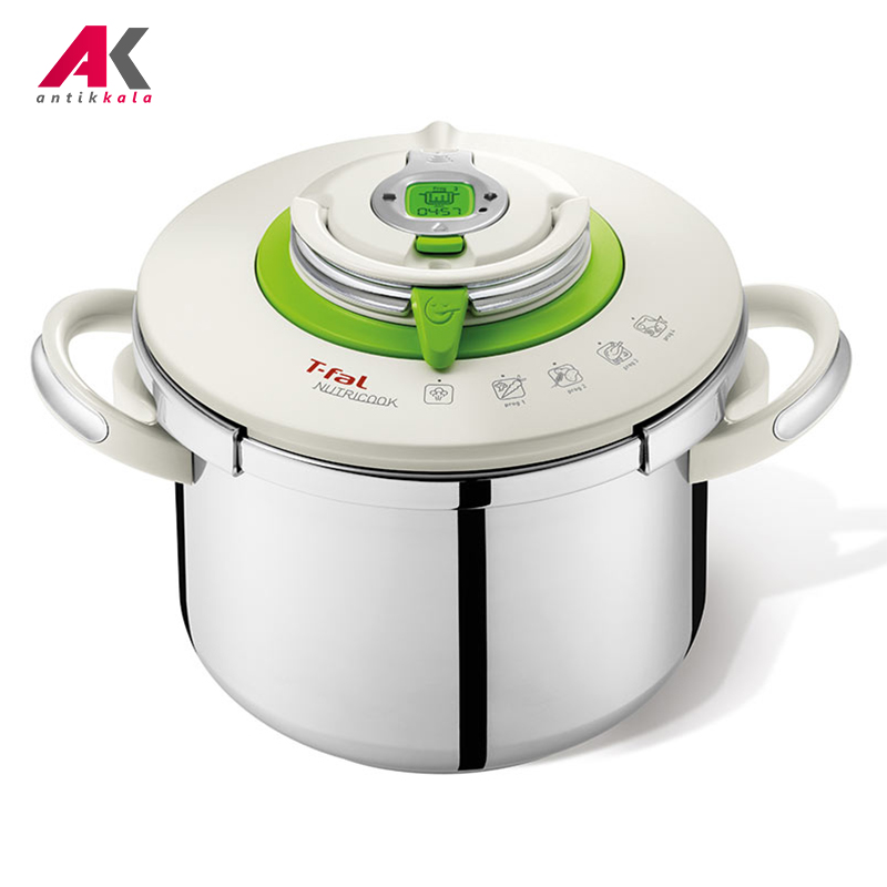 زودپز 6 لیتری تفال مدل TEFAL NUTRICOOK، با جنس بدنه ای از استیل ضد زنگ و با دیزاینی جذاب از تولیدات این برند ساخت کشور فرانسه است. درب تعبیه شده بر روی زود پز دارای قابلیت باز شدن به صورت اهرمی بوده که وجود درپوش در قسمت بالایی آن، در زمان وجود بخار بالا و غیر قابل تحمل امکان تخلیه بخار را به راحتی و به سرعت مهیا میسازد. این زود پز با اعمال فشار و حرارت مناسب قادر به پخت انواع مواد غذایی با بافت های متفاوت همچون انواع گوشت، برنج، خورشت و … خواهد بود. وجود تایمر هوشمند در زودپز NUTRICOOK تفال، امکان تنظیم زمان پخت را سهل کرده که این زمان بر روی پنل نمایشگر تعبیه شده بر روی درب زودپز قابل مشاهده است. تعبیه 4 برنامه برای پخت مواد غذایی، باز شدن آسان درب با یک دست، سیستم منحصر بفرد برای حفظ هر چه بیشتر طعم غذا، نشان دهنده میزان بخار در تایمر، قابلیت استفاده بر روی انواع اجاق ها، جنس چدنی کف زودپز، وجود 3 دستگیره ضد حرارت و 5 عملکرد برای حفظ ایمنی به وسیله سوپاپ ایمنی از جمله ویژگی های زودپز 6 لیتری تفال مدل TEFAL NUTRICOOK هستند. این زودپز در دو ظرفیت 6 و 8 لیتری عرضه میشود.