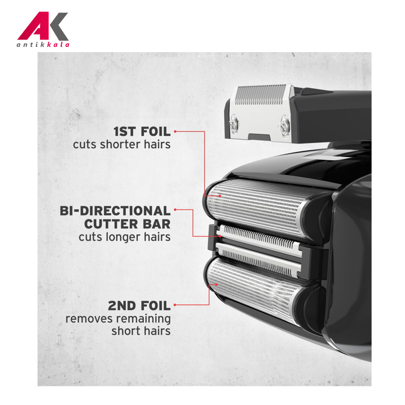 تیغه فویلی برای اصلاح موهای بلند ,قسمت فویل با سوراخ های ریز جهت اصلاح نزدیکتر به پوست و دقیق موها و اصلاح نهایی موهای باقیمانده ,قسمت فویل با سوراخ های ریز جهت اصلاح موهای کوتاه تر |